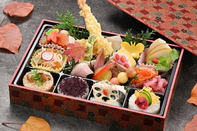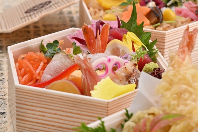 季節の八寸、焚き合せ、揚物、和え物、洋食の盛合せ、3種類の御飯、水菓子を9マスのお弁当箱に。華やかな彩りと深い味わいが織りなす一品です。
