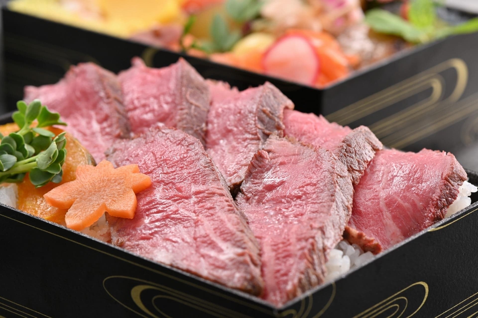 ジューシーなステーキ肉がご飯の上にたっぷり!男性にも人気のお弁当です。ステーキ肉はご飯が見えないくらいにのっています。八寸のおかずがぎっしり入った二段のお弁当でお届けしますので、ボリュームも大満足。極上のステーキ会席弁当です。